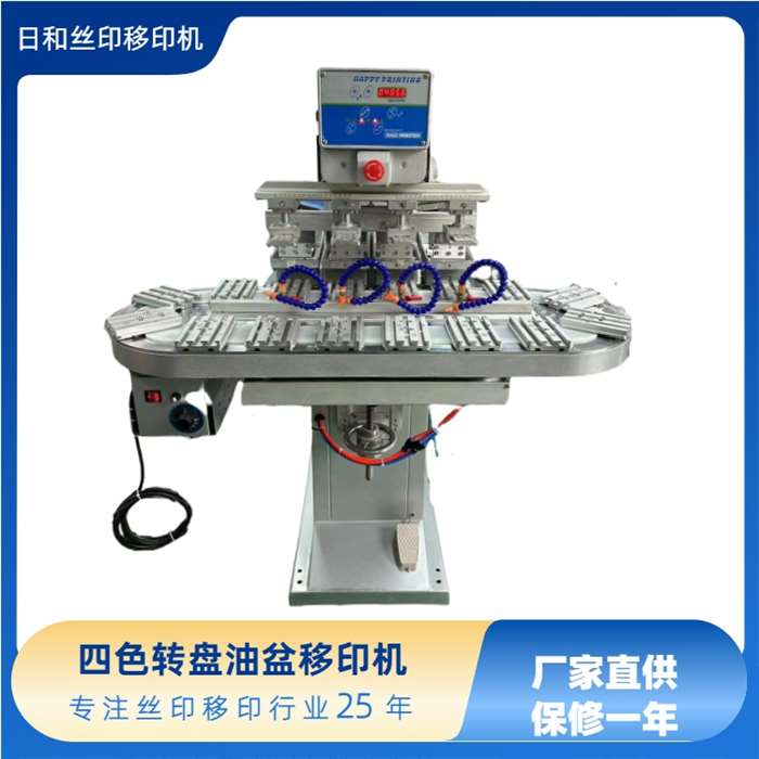 这是一款中型的四色转盘式移印机,此款机型适用范围极广,是当前最多厂家选择的四色移印机,油杯式设计,符合环保标准,转盘式的结构使它可在同一生产周期内循环进行四色套印,转盘采用日本高精度CNC加工,速度快,性能稳定,相比穿梭移印机,调较复杂,最快印刷速度1500次/小时,最大印刷面积60*120MM,适合在电子产品,工艺品,玩具等产品表面图案LOGO印刷。
